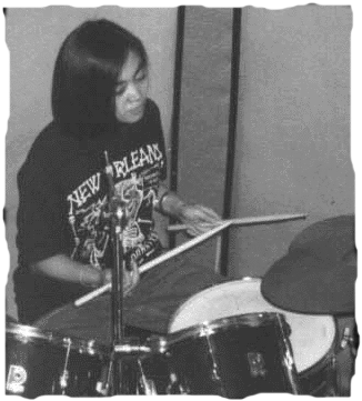 DORKY is the female mutation of Alfred E. Neuman, Bart Simpson, Daffy Duck, Calvin, and Hobbes. She started playing drums by chance when she saw an ad for drum lessons one summer and decided to blow her last P300 on it. The bangs and the whallops all came out naturally and she then wished she had started earlier. She looks exactly like the main female lead in the movie "HEAVEN & EARTH". But only Dorky can burp and laugh like Dorky. She owns two sets of drums, a Tama and a Premiere, is influenced by various drummers, and has exhanged phone numbers with Vinnie Colaiuta, Sting's drummer. Dorky works for a top advertising agency and may have been the art director of that new ad you've seen or heard lately. Her favorite quote: "CONFUCIOUS SAY HE WHO SLEEPS WITH AN ITCHY ASS WAKES UP WITH A SMELLY FINGER..." Her favorite coat: black denim jackets, anything soccer, but is basically a t-shirt person. |